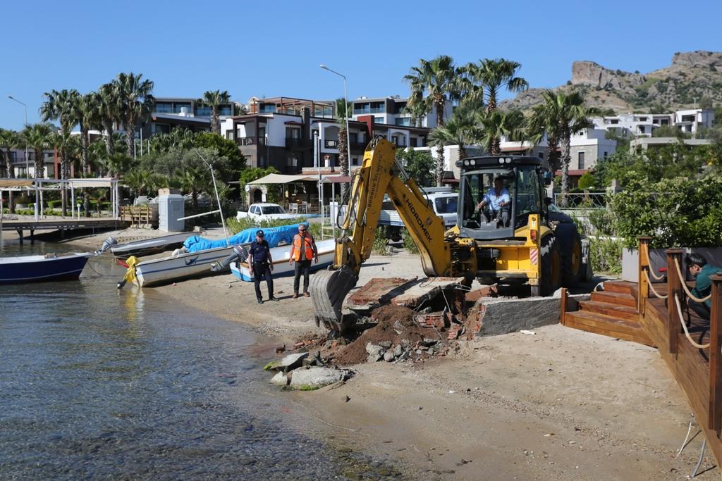 Öte yandan kaçakla mücadele seferberliği kapsamında, haklarında yıkım kararı alınan yapılara müdahale de devam ediyor. Gündoğan Mahallesi’nde özel bir sitenin ruhsatlı olduğu öğrenilen iskelesini çevreleyen kaçak duvar ve çiçeklik Belediye ekipleri tarafından yıkılarak ortadan kaldırıldı. Sahilde yayaların yürüyüşünü engelleyecek şekilde deniz içerisine kadar uzanan duvar ve çiçekliğin kaldırılması, vatandaşlar tarafından da ilgiyle izlendi.