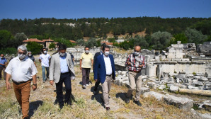 Muğla Valisi Orhan Tavlı, Stratonikeia Antik Kentini Kazı Başkanı Prof. Dr. Bilal Söğüt ile birlikte gezerek ilk girişte bulunan karşılama merkezi, köy meydanı, gymnasium, batı cadde, kuzey şehir kapısı, Bouleuterion, tiyatro ile Hasan Şar ve Bılla konaklarını ziyaret ederek, kazı alanları ve restorasyon çalışmalarını inceledi.