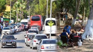 Gökova Körfezinin Sakin şehri Akyaka’da araç kuyrukları oluştu .