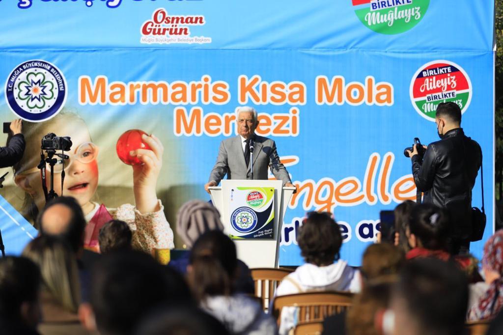 Muğla Büyükşehir Belediye Başkanı Osman Gürün de yaptığı konuşmada Kısa Mola Merkezlerinin anne ve çocuklar için rehabilitasyon merkezleri haline geldiğini vurgulayarak; “Yıllarca doktorluk mesleğini icra etmem sebebiyle, bu konuya özel bir eğilim gösterdim. Zihinsel engelli bireylerimizin aileleri 7 – 24 çocuklarıyla ilgilenmek zorundadır ve en yakını olan babasına dahi emanet etmekten çekinen anne çocuk ilişkisi kurulmaktadır. Hiçbir yere gidemeyen ve çocuğundan ayrılmak istemeyen anne ve ondan ayrılmak istemeyen bir çocuk. Bu psikolojik olarak sağlıklı olmayabilir. Bu nedenle hem anne, hem engelli birey için onların rahat olabileceği bir ortam yaratmak istedik. Bu merkezler kısa sürede anne ve çocuk üzerinde çok olumlu bir etki yarattı. Artık annelerimiz çocuklarını merkezlere kendi getirmiyor. Bizi arıyorlar biz evden çocuklarımızı alıyoruz ve bu süre içinde anne de sosyalleşebiliyor. Bu, anne ve çocuk üzerinde büyük bir rehabilitasyon sağlıyor. “ dedi. AjansCanka
