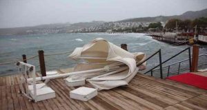 Muğla’nın Bodrum ilçesinde sabah saatlerinde başlayan lodos nedeniyle dev dalgalar sahilleri dövdü. Meteoroloji kırmızı kod uyarısı verirken, fırtına saate 80 kilometre hıza çıktı.