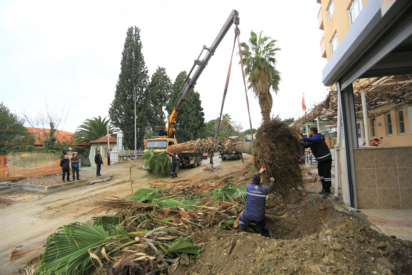 Muğla Büyükşehir Belediyesi tarafından Yatağan ilçesinde yapımına başlanan 10 milyon 480 bin TL’lik alt ve üst yapı çalışmaları devam ediyor. Çalışmalar kapsamında Mehmet Özcan Caddesi üzerinde yapımına başlanan yol ve kaldırım çalışmaları nedeniyle 5 adet palmiye ağacı zarar görmemesi için bulundukları bölgeden güvenle sökülerek Yatağan Atıksu Arıtma Tesisine dikildi.