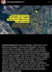 “Sayın Ali Ağaoğlu, hatırlarsanız önce Bodrum’da olduğunu söyleyerek tanıttığınız, itirazımız üzerine Milas’ta olduğunu kabul ettiğiniz “suni cennet” projenize karşı sivil toplum örgütlerinin açtığı davalarda mahkeme tarafından tespit edilen bilirkişi heyeti, projenizin; 197 tür kuşun yaşadığı Tuzla Sulak Alanını yok edeceğini tespit etmekle birlikte, ÇED raporu alabilmek için verdiğiniz “Su kaynaklarını olduğu gibi bırakacağız” taahhüdünüze rağmen, DSİ’den habersiz olarak yaptığınız baraj ve göletleri de tespit etmiş!! Ali Bey, membranlı göletlerle yönünü değiştirdiğiniz derenin akışı kesilen tatlı suyu, sizin şirketler grubunuzun değil, halkın malıdır. Özetle size demek istediğim, biz bu olup bitenleri görmemezlikten gelmeyiz, gelmeyeceğiz.”