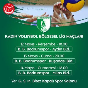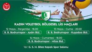 Bodrum Belediyesi Bodrumspor Kadın Voleybol Takımı, Türkiye Voleybol Kadınlar 2’nci Ligi’ne yükselmek için maçlarını Bodrum oynayacak. Bitez’de bulunan Bodrum Kapalı Spor Salonu’nda oynanacak bölgesel lig müsabakaları ilk maçını 12 Mayıs Perşembe günü Aydın Sönmezspor ile oynayacak B.B. Bodrumspor Kadın Voleybol takımı, 13 Mayıs Perşembe günü saat 20.00’da Kuşadası belediyesi, 14 Mayıs Cumartesi günü ise saat 18.00’da Milas Belediyesi ile karşılaşacak. Müsabakalar sonunda birinci olan takım önümüzdeki yıl 2.Türkiye Ligi’nde mücadele edecek. Kazım Tokuç