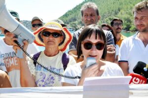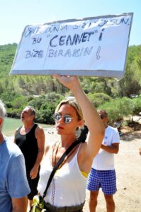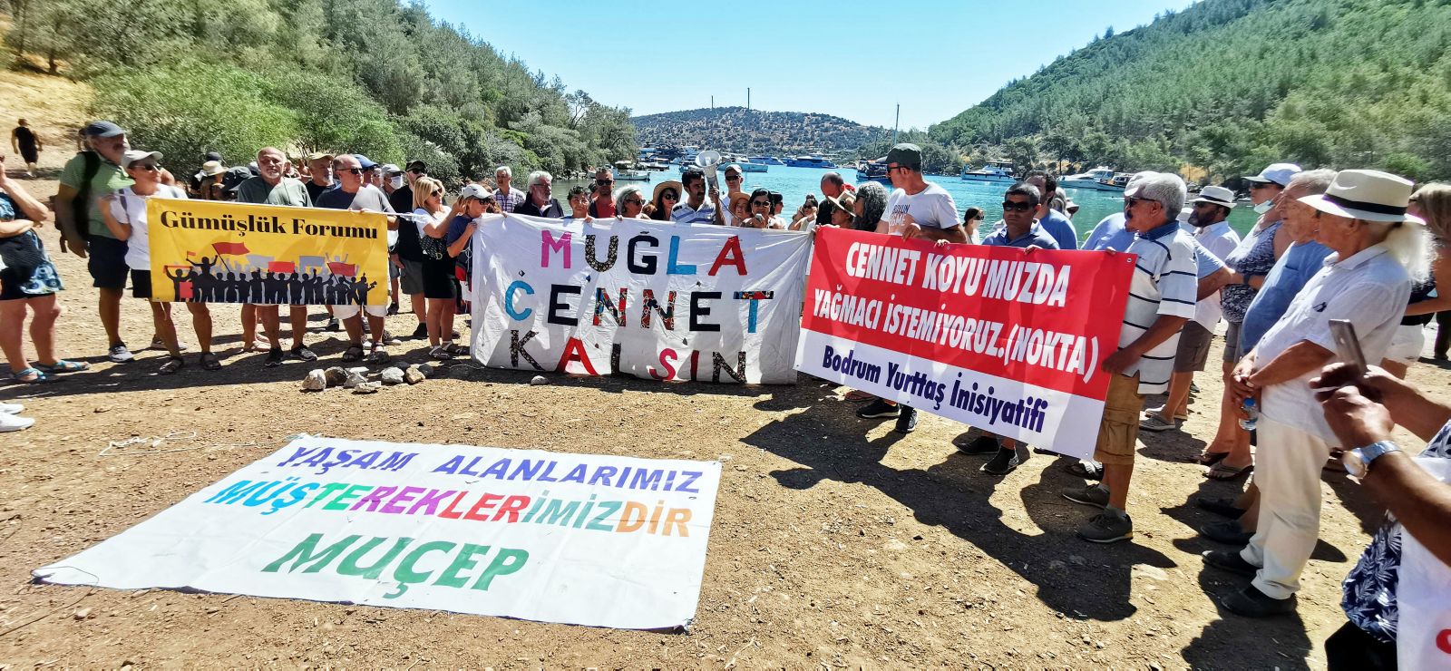 Doğal ve arkeolojik sit alanları ile kaplı dünyaca ünlü Cennet Koy’da Cengiz Holding tarafından yapılmak istenen turistik tesis ve lüks villaların yer alacağı inşaat öncesinde Bodrumlular eylem yaptı. Cengiz Holding’in bölgede cenneti cehenneme çevirecek projesinden acil olarak vaz geçmesi çağrısında bulundular. Umay Karabaş “Bunun adı doğayı, tarihi, geleceği düşünmeden üç günlük rant peşinde koşmak hiç doymamak” dedi.