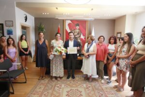 ÇYDD Genel Başkan Yardımcısı Lale Pilatin, Bodrum Şube Başkanı Meral Saraçbaşı ve Türkiye’nin çeşitli illerinden gelen üniversite öğrencisi 30 kişilik ÇYDD’li gençlerden oluşan grup önceki gün Bodrum Belediye Başkanı Ahmet Aras’ı makamında ziyaret etti.