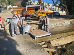 Koyunbaba Mahallesi’nde gerçekleşen Halk Buluşmasında bir vatandaşın, Bölme Halk Plajı’na engelli platformu talebinde bulunması üzerine, Destek Hizmetler Müdürlüğü ekiplerince yapımı tamamlanan engelli platformu plaja yerleştirildi.