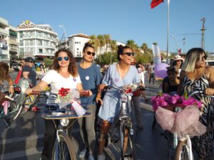 Marmaris sakini kadınların yanı sıra başta Ukraynalılar olmak üzere, kentte yerleşik yaşayan diğer yabancı kadınların da destek verdiği etkinlikte söz alan Yağmur Tezcan; “2013 yılında ilk kez İzmir’de bir grup kadın tarafından düzenlenen Süslü Kadınlar Bisiklet Turu; her yıl yeni şehirlerin katılımı ile büyüyerek uluslararası bir bisikletli kadın hareketine dönüştü. Gönüllü kadınların bireysel katılımı ile organize edilen bisiklet turu; yıllar içinde İtalya’dan Almanya’ya Kanada’dan İran’a birçok ülkede binlerce kadının bisiklete binmeyi öğrenmesine ve bisiklet kullanımını günlük hayatlarına dahil etmelerine neden oldu.
