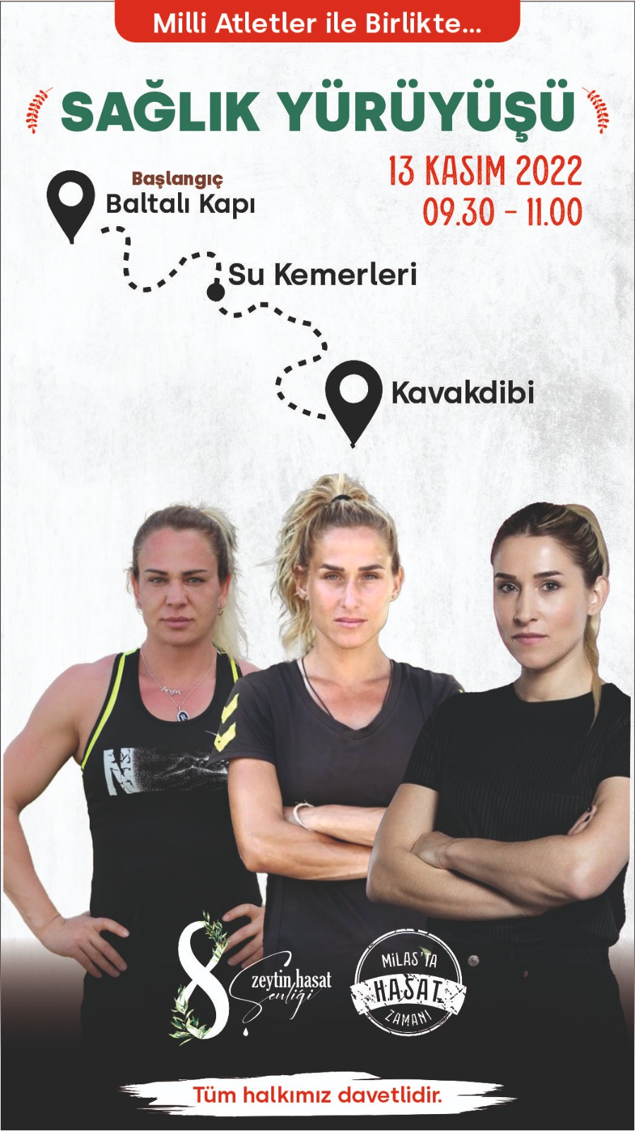 13 Kasım Pazar günü sabah saat 09.30 – 11.00 saatleri arasında gerçekleşecek yürüyüşe tüm Milas halkını davet eden Milas Belediye Başkanı Muhammet Tokat; “Şenliğimizin ikinci gününde Baltalı Kapı – Su Kemerleri – Kavakdibi güzergahında sağlık yürüyüşü yaparak güne başlayacağız. Milli atletlerimiz ve Milas Dağcılık – Doğa Sporları Kulübü’müzün katılımlarıyla destek vereceği yürüyüşe tüm halkımız davetlidir.” dedi.