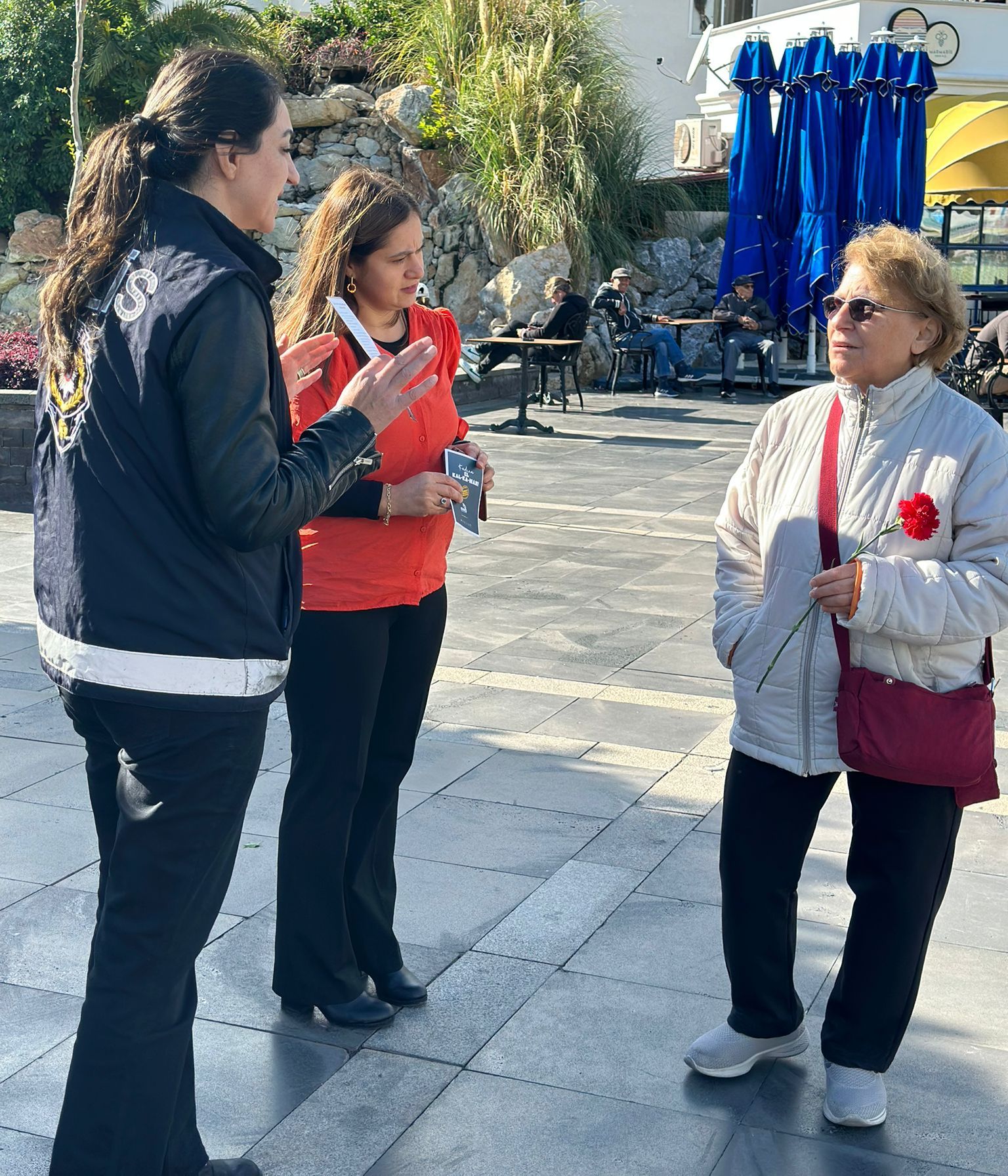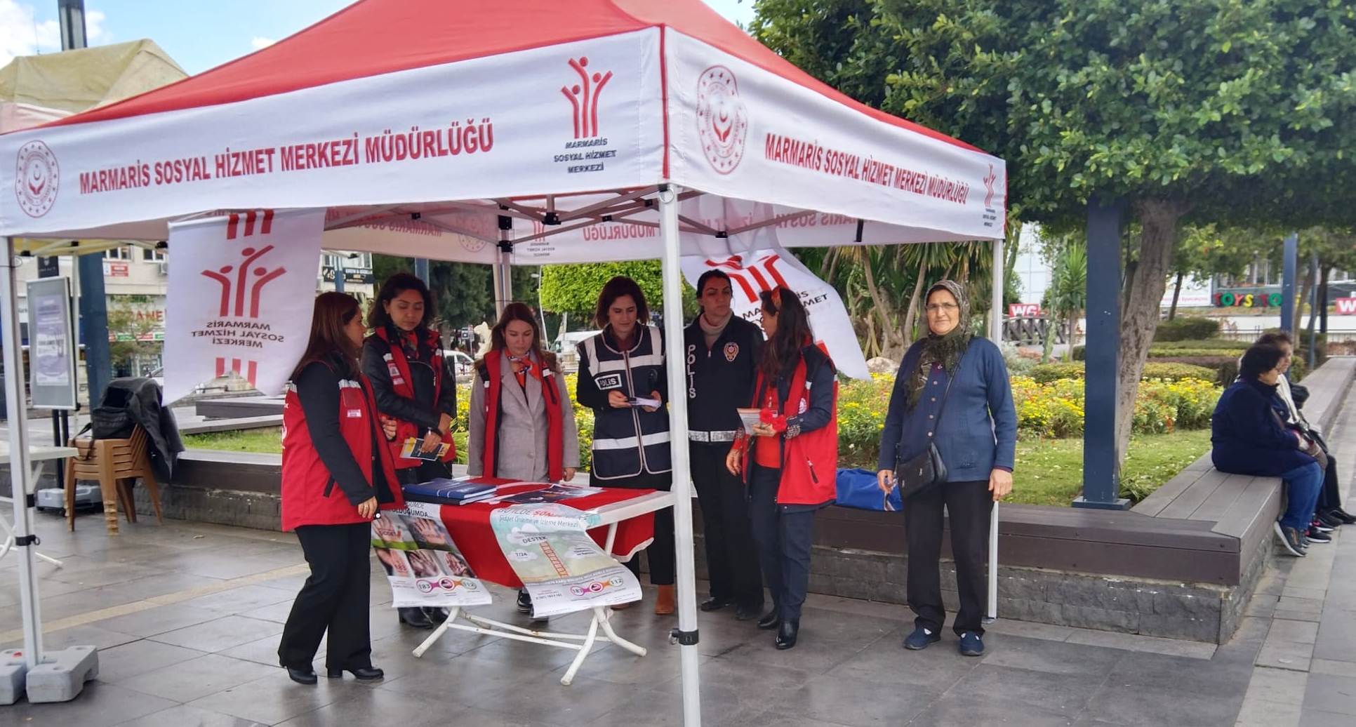 Marmaris Sosyal Hizmet Merkezi Müdürü Yeşim Köksal’ın koordinatörlüğünde; 19 Mayıs Gençlik Meydanı’nda kurulan stand önünde merkez personelleri ve kadın jandarma ve polisler, vatandaşlara karanfil verdi ve şiddete karşı alınacak tedbirler hakkında bilgilendirme yaptı.
