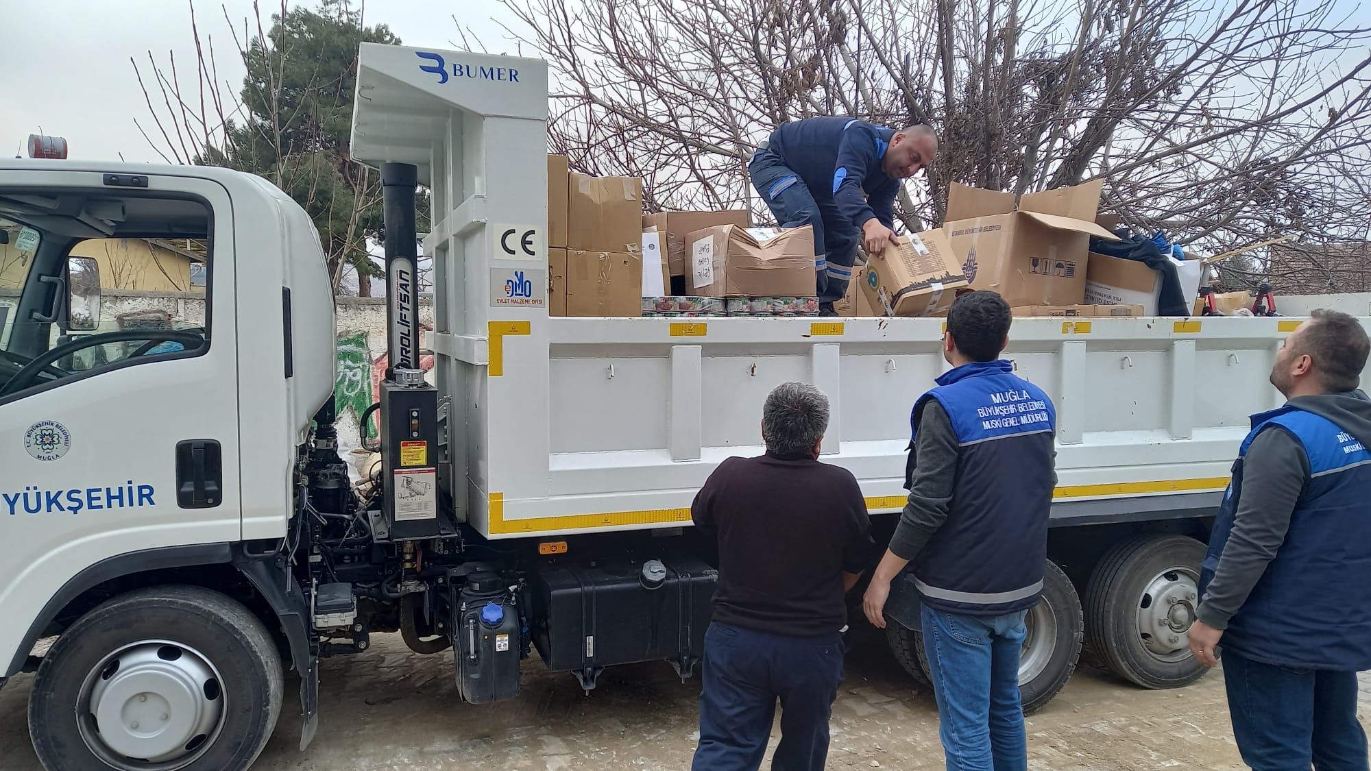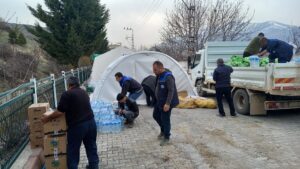 Muğla Büyükşehir Belediyesi, deprem bölgelerinde çalışmalarını sürdürürken gıda kolisi ve kışlık kıyafet dağıtımına devam ediyor.