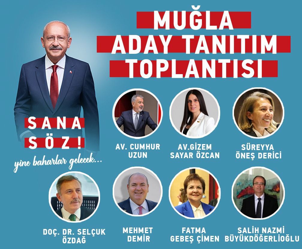 14 Mayıs Genel seçimleri ve 28. Dönem Milletvekili seçimleri öncesi CHP Muğla İl Başkanlığı tarafından milletvekili aday tanıtım toplantısı yapıldı. CHP Muğla Milletvekili Adayları olan; Cumhur Uzun, Gizem Özcan, Süreyya Öneş Derici, Selçuk Özdağ, Mehmet Demir, Fatma Gebeş Çimen ve Salih Nazmi Büyükdöğerlioğlu’ nun katıldığı tanıtım toplantısı Gazi Mustafa Kemal Atatürk Kültür Merkezi’nde yapıldı.
