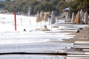 Ortakent sahilindeki şezlong ve şemsiyeler dalgalarla denize sürüklendi. Ahşap iskeleler parçalandı. Bazı işyerlerinin tabela ve güneşlikleri hasar gördü