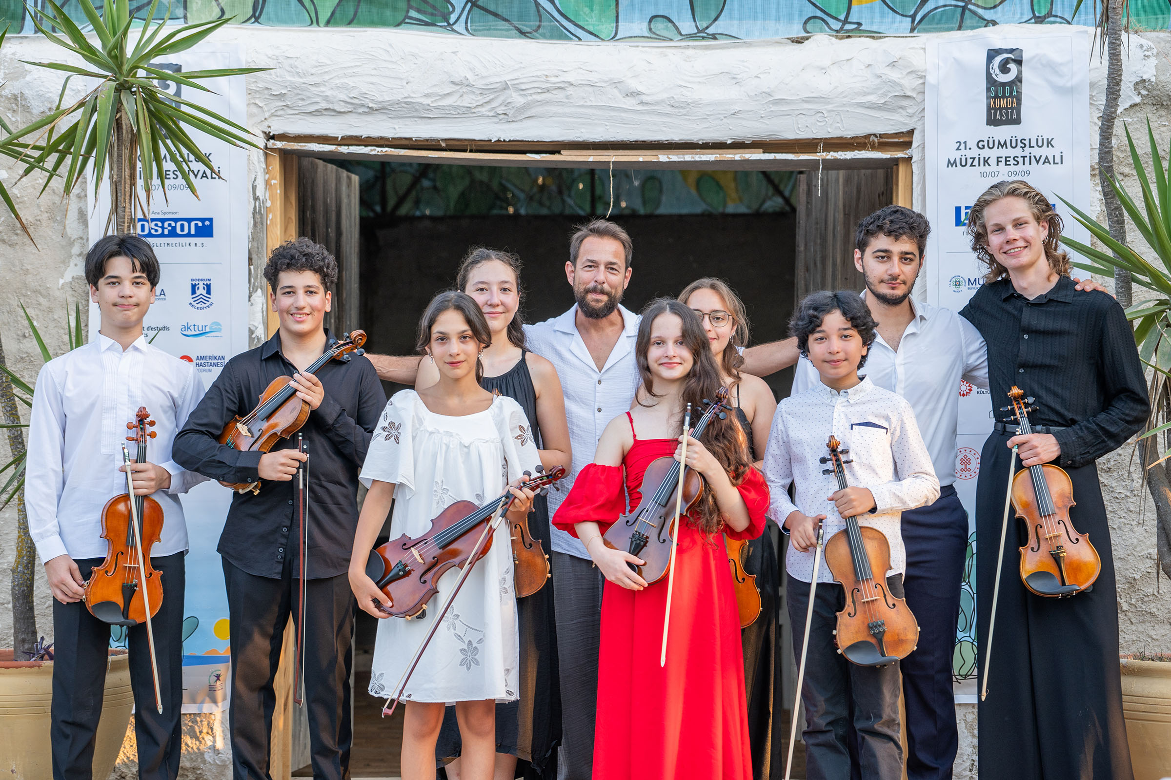 Gümüşlük Festival Akademisi (GFA) tarafından 2006’dan beri düzenli olarak gerçekleştirilen masterclasslar kapsamında bu yıl ilk sınıf mezunlarını verdi. 2024’ün ilk ustalık sınıfına katılan Keman Masterclass öğrencileri, keman sanatçıları Kristóf Barati ve Erkin Onay’la bir hafta boyunca müzikal bilgi ve enstrümanlarında ustalık kazandılar. Yoğun etüt programı ve derslerin sonunda geçtiğimiz akşam festivalin Gümüşlük sahilindeki sahnesi Toprak Ev’de izleyici karşısına çıkan GFA Keman Masterclass öğrencileri, keman için yazılmış eserlerden derledikleri bir repertuvarla sahneye çıktı.