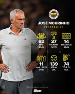 Fenerbahçe’de 62 maça çıkan Jose Mourinho, 37 galibiyet, 14 beraberlik ve 11 mağlubiyetlik performans yaşadı. Portekizli teknik adam 2.02’lik puan ortalaması yakaladı.