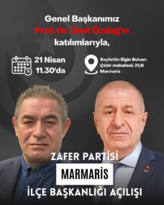 Zafer Partisi Genel Başkanı Prof. Dr. Ümit Özdağ, yarın (21 Nisan 2026) Marmaris’te Zafer Partisi Marmaris İlçe Başkanlığı binasının açılışını yapacak, bir dizi ziyaretlerde bulunacak.